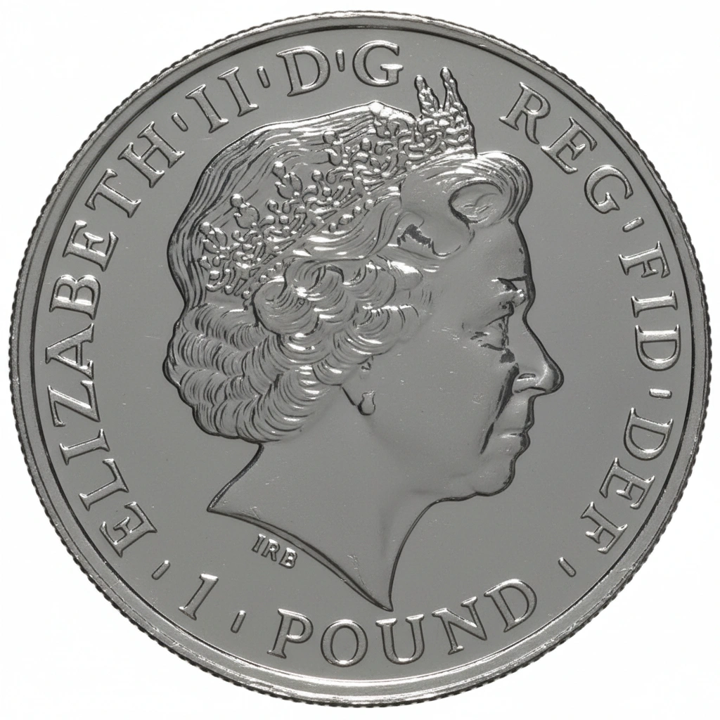 - Vorderseite: Zeigt das Portrait von Königin Elisabeth II. geprägt. Die Umschrift mit lateinischen Abkürzungen „ELIZABETH II – D G REG – FID DEF“ besagt: Elizabeth II. – Königin von Gottes Gnaden – Verteidigerin des Glaubens. Am unteren Rand der Anlagemünze ist der Nominalwert angegeben.